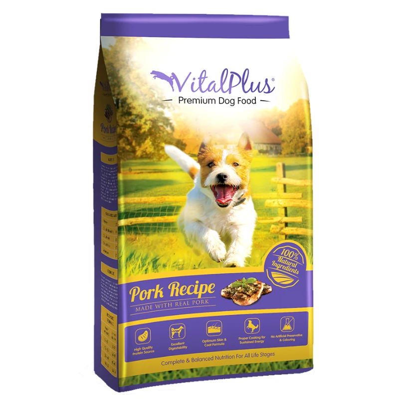 VitalPlus Premium Dog Food Pork Recipe is a complete and balanced food for dogs of all breeds. It is made with real meat of high biological value and energy dense selected quality proteins with vitamin and minerals the dogs require for a healthy life. Our recipes contains highly digestible carbohydrates to aid in digestion and help preventing intestinal disorder. In addition, it is enriched with various supplements to support the overall wellbeing of the dogs – Vitamin A, Copper and Essential Fatty Acids to promote a soft and shiny coat, Vitamin E and Selenium to strengthen the immune system. Hard and crunchy kibble also helps to strengthen the teeth and promote dental care.