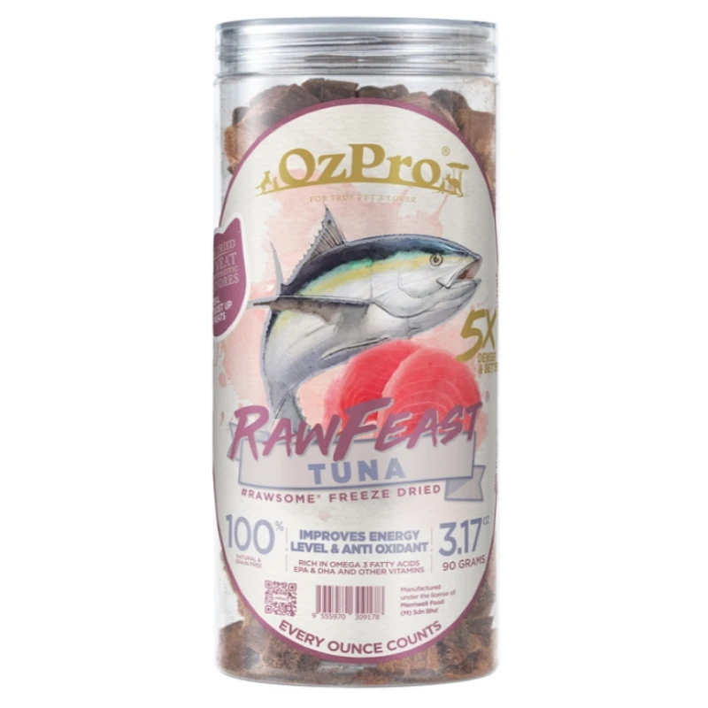OzPro RawFeast Freeze Dried Tuna rich in Omega 3 fatty acids EPA & DHA to improve inflammatory conditions, such as allergies, arthritis, inflammatory bowel disease and skin disease. Tuna provides the most irresistible taste for felines and knowns as ‘the chicken of the sea’. It is