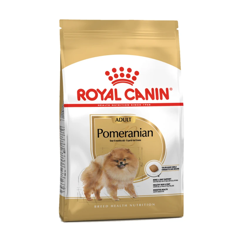 ROYAL CANINĀ® Pomeranian Adult is a tailor-made, breed-exclusive formula especially for adult Pomeranian dogs like yours. ROYAL CANINĀ® Pomeranian Adult contains advanced nutrients and an adapted mineral content to help support healthy joints and bones. This formula helps to support the natural protective barrier function of your dogās skin, while also nourishing the Pomeranianās glorious coat. This recipe uses high quality, highly digestible proteins to help support efficient digestion. Its balanced blend of fibres helps to facilitate healthy internal transit and promote optimal stool quality.