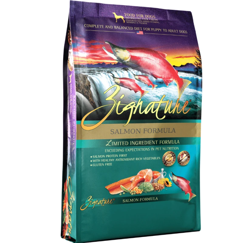 Our Salmon Formula is loaded with heart healthy Omega-3 fatty acids. These fatty acids lower blood triglyceride levels, which in turn lowers overall body fat. Salmon is also packed with lean protein for building lean muscle mass and maintaining strong bones. Our Salmon Formula is completely grain free, and that can help with dogs that have food sensitivities or allergies. We also include plenty of antioxidants and low glycemic carbohydrates for a healthy, satisfied dog. ZignatureĀ® Salmon Formula ā Learned from Nature, Crafted to Perfection.
