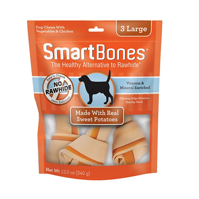 SmartBonesĀ® have all the benefits of a rawhide chewā¦WITHOUT the RAWHIDE! NO RAWHIDE SmartBonesĀ® are made with REAL SWEET POTATOES, CHICKEN and other wholesome VEGETABLES for a scrumptious taste dogs canāt resist!